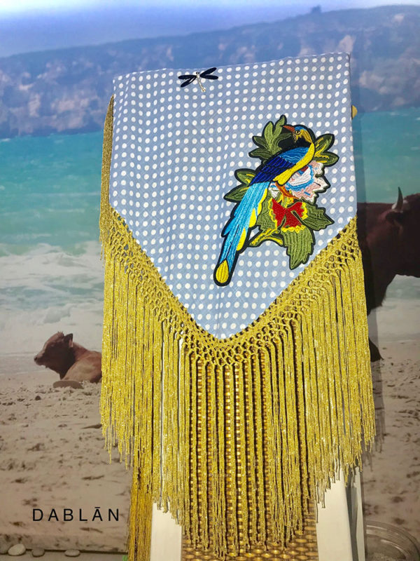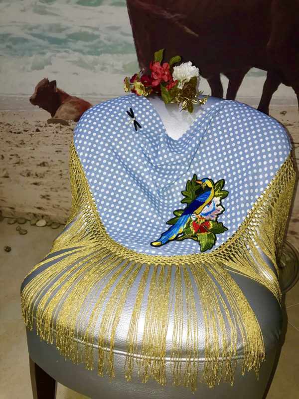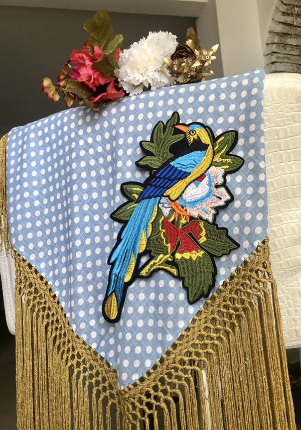 Mantoncillo de flamenca con Libélula estampada. Tonos azul y blanco y flecos dorados